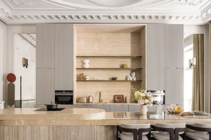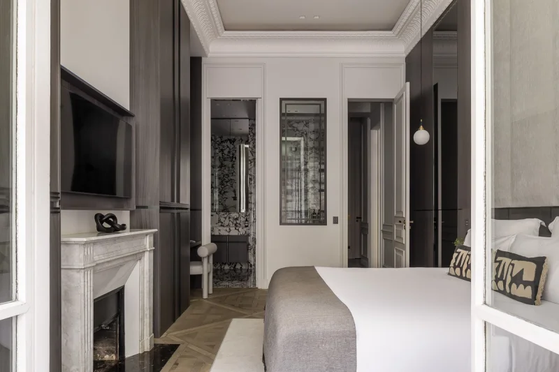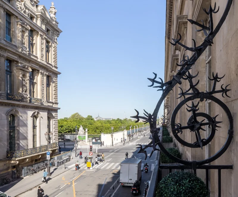 Located right across the Tuileries Garden and the Louvre Museum, this sumptuous 115 sqm serviced apartment, on the 2nd floor of a Haussmannian building with an elevator, is a rare gem with exceptional features.