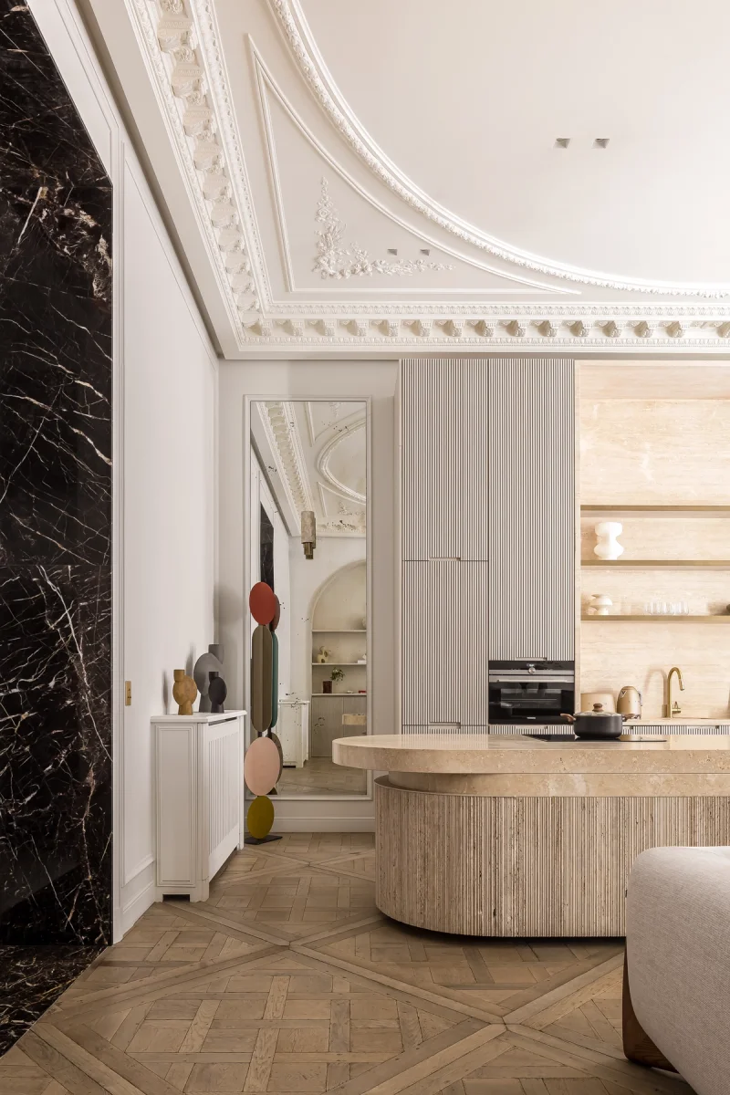 The entrance opens onto a spacious living room with an impressive high ceiling, Versailles parquet flooring, intricate moldings, and a marble fireplace...