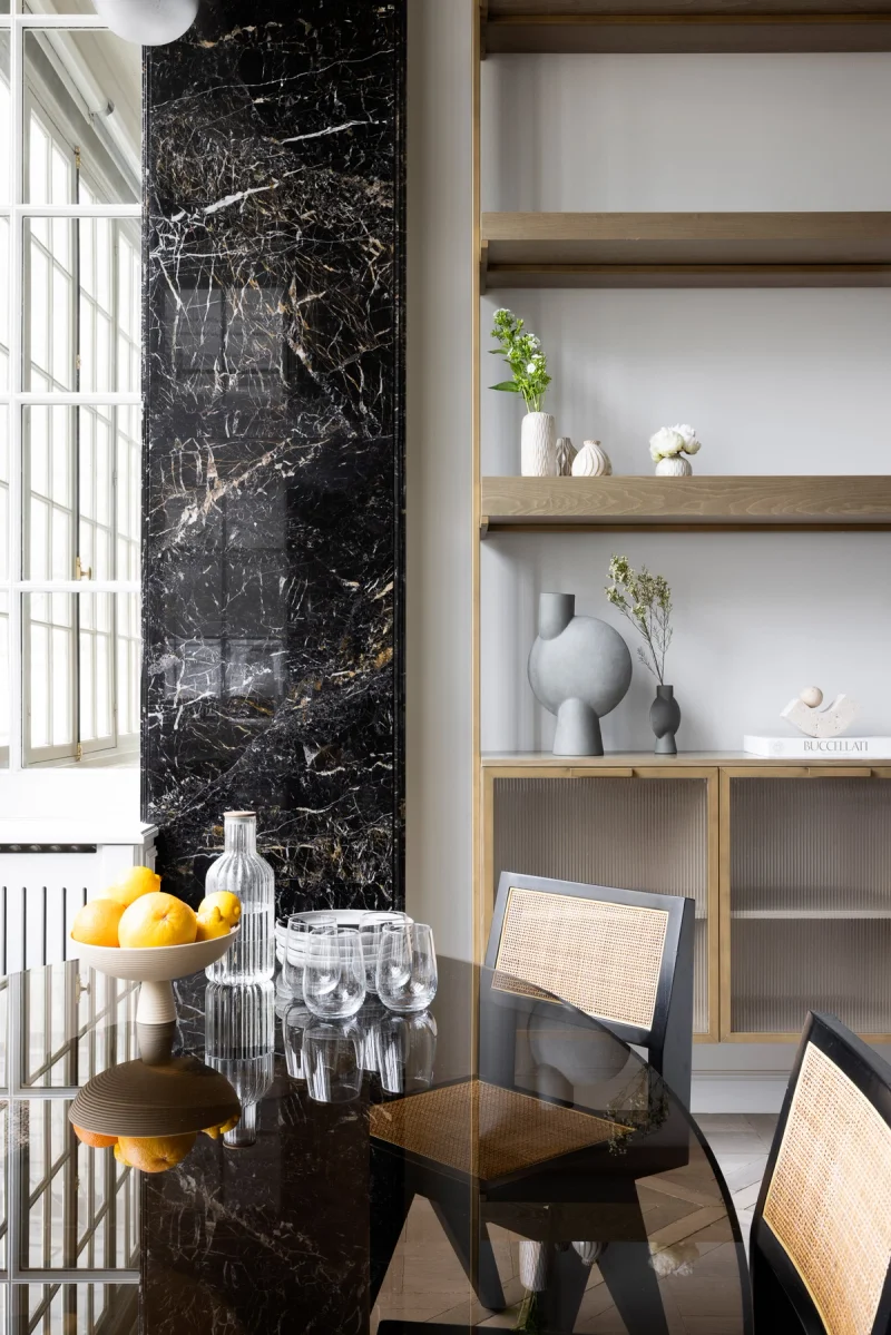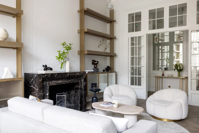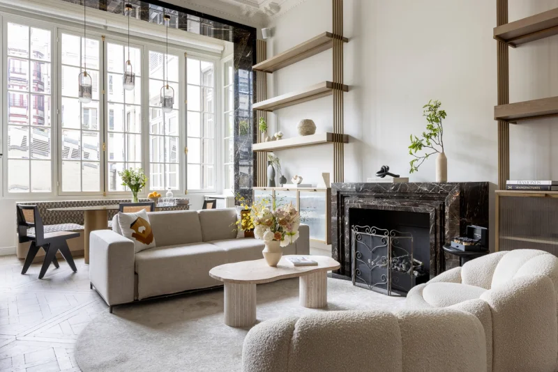Upon entering, you are greeted by an impressive high ceiling that immediately evokes a sense of space and luxury. The spacious living room, with its comfortable sofa and armchairs near a magnificent marble fireplace, is perfect for relaxation and spending convivial moments together...