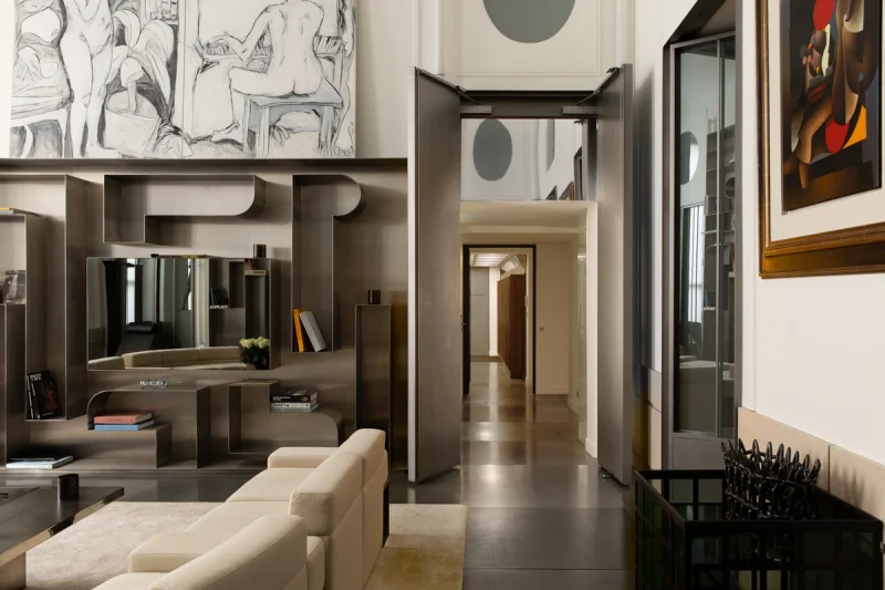 Upon entering, a series of mirrors and architectural lines sets the tone. The living room, with its high ceilings and twin steel bookcases, evokes the creative energy of the couturier’s early fittings...