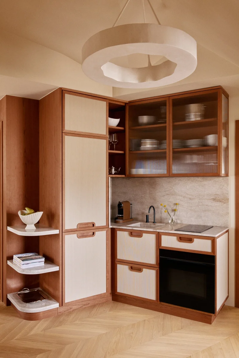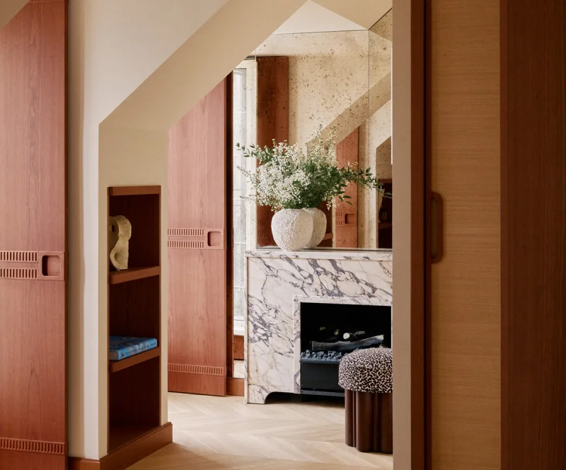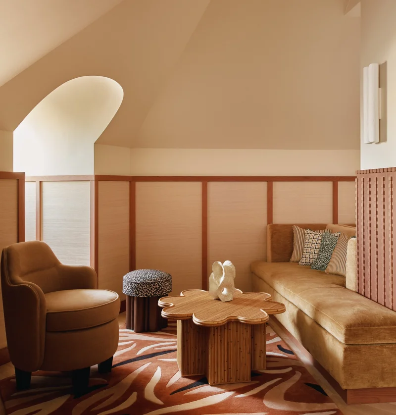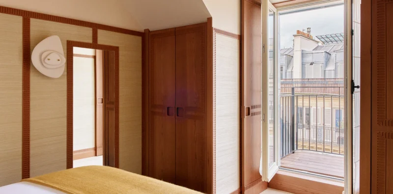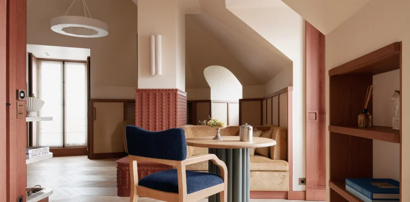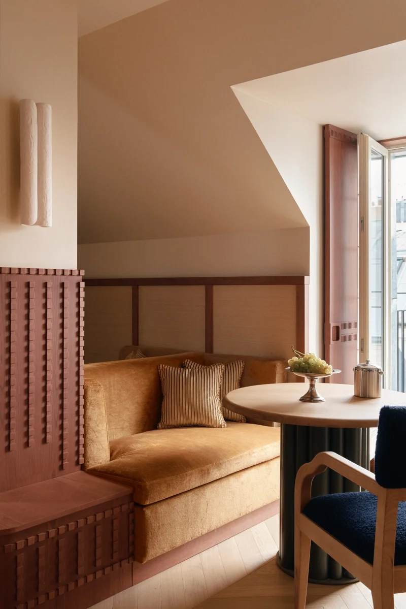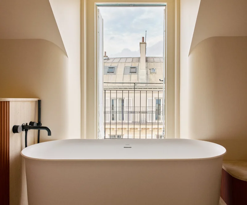 Beneath the residence's rooftops, La Suite Vintimille unfolds its soft curves and cosy atmosphere, designed as a Parisian retreat. From the living room, the view opens onto the city's rooftops, while a typically Parisian oeil-de-bœuf window frames the Sacré-Cœur like a living painting...