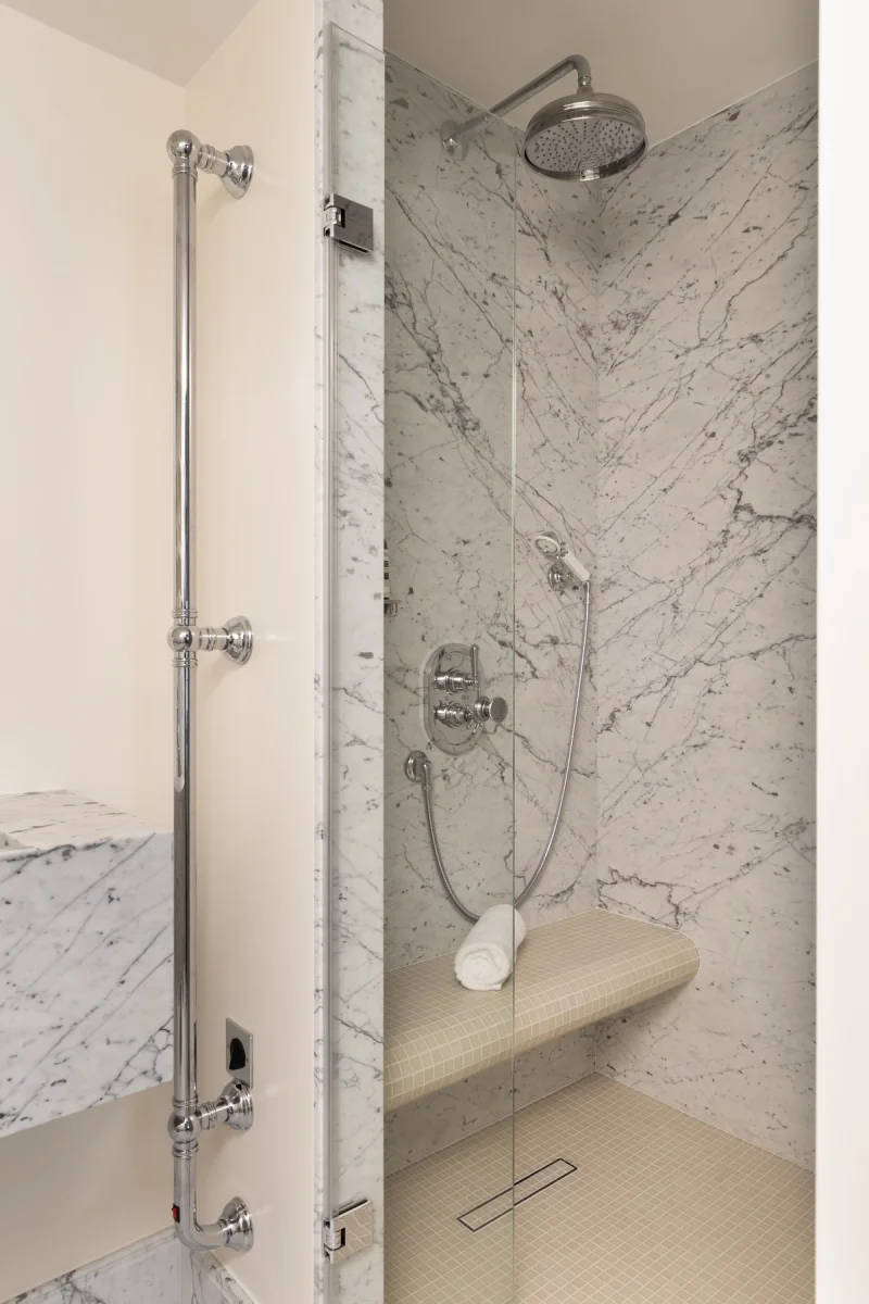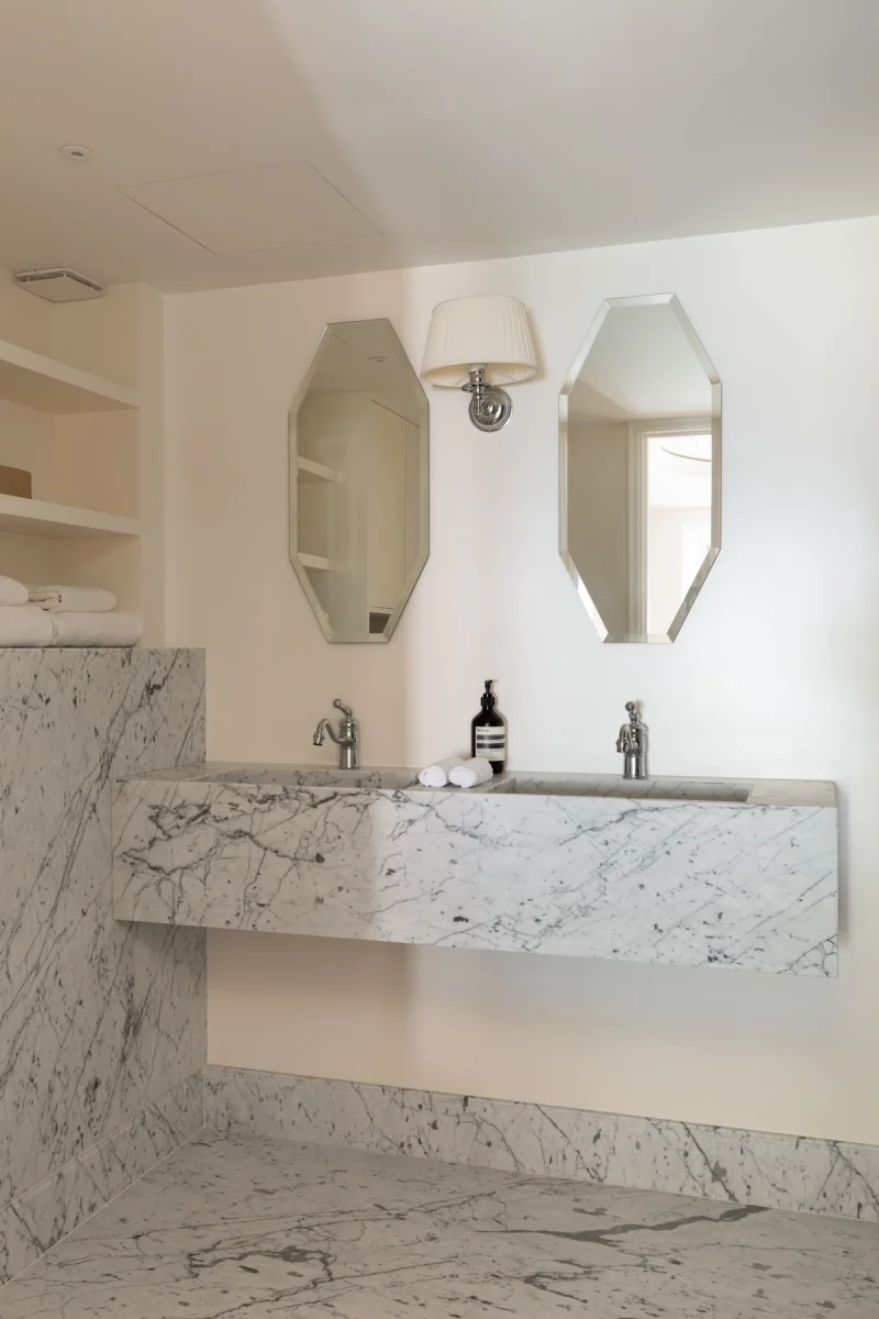 This superb, entirely renovated 90 sqm apartment opens onto a welcoming living room with an open kitchen, enhanced by an attractive marble dining table, like a link between the kitchen and the living room...