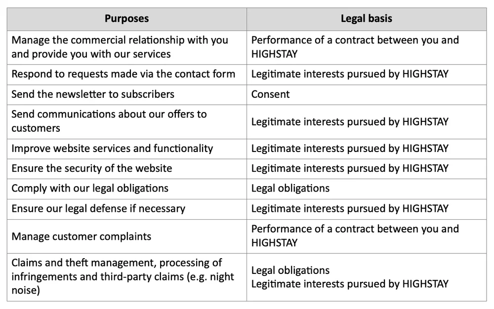 SNC HIGHSTAY (“HIGHSTAY” or “we”), registered with the Paris Trade and Companies Register under number 917 956 070, and whose head office is located at 336 rue Saint-Honoré 75001 Paris – France, cares about protecting your privacy and takes data security very seriously. To demonstrate that we are worthy of the trust you place in us, we are committed to transparency and clarity about our use of your data. This Privacy Policy explains how and for what purposes we process the data you provide us via our platform, as well as the length of storage and the third-party service providers who will have access to your data. We also inform you about your rights regarding your personal data and how you can exercise those rights. Therefore, we encourage you to read this document carefully. In accordance with the applicable regulations, we wish to specify that we collect only the data strictly necessary for the provision of our services and that the data will be used exclusively for the purposes described herein.