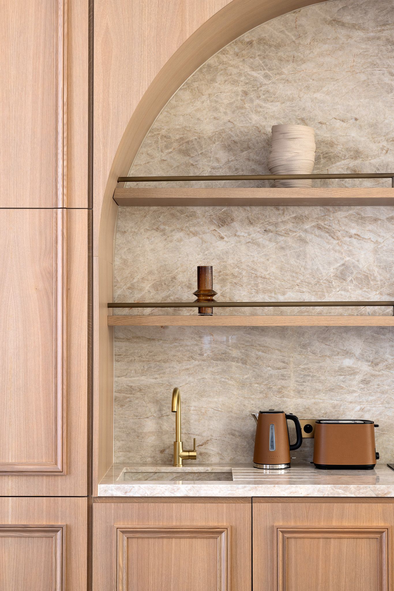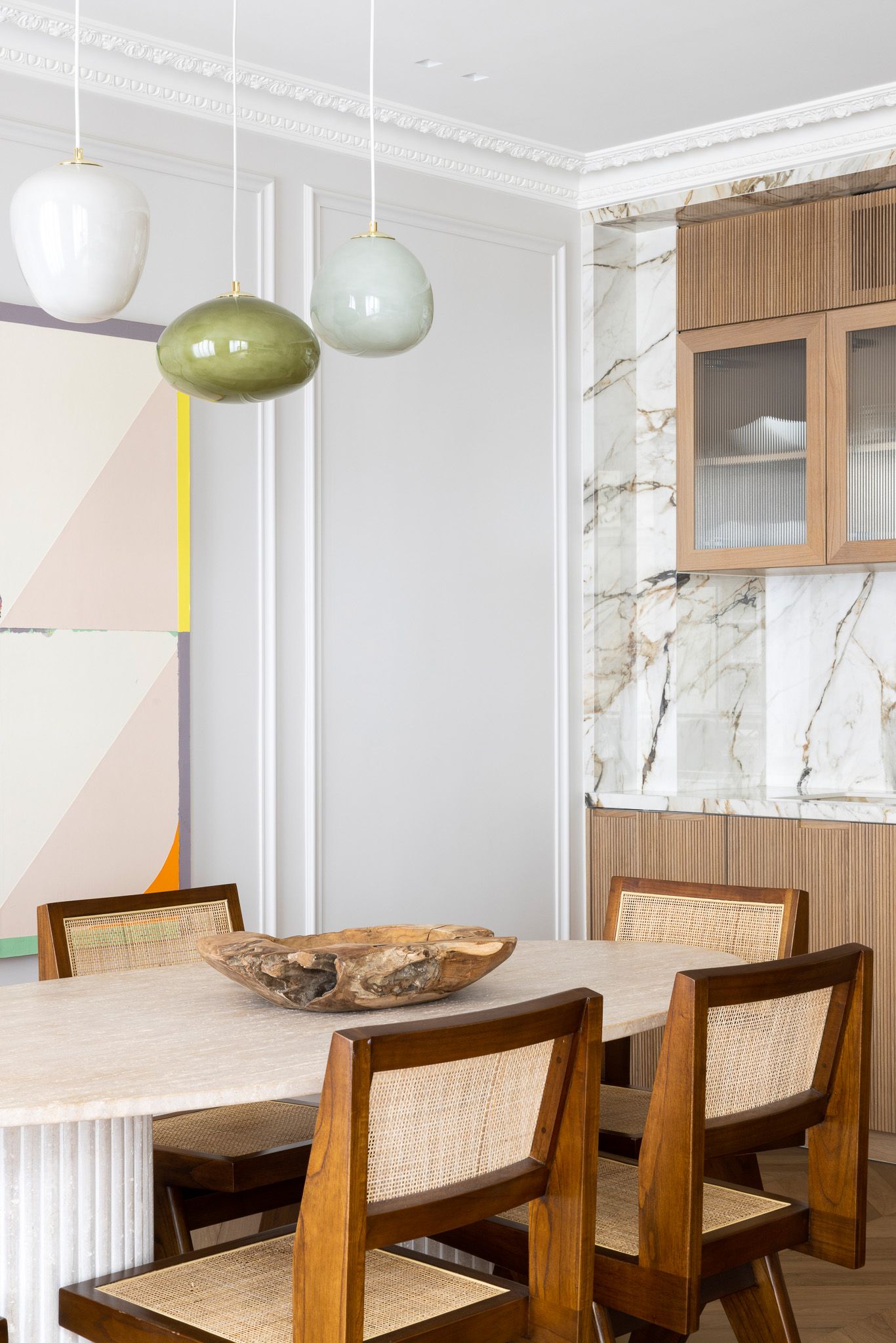 Chêne brut, travertin, marbre emperador se marient parfaitement avec le mobilier et les douces couleurs murales. La cuisine ouverte est la continuité de la pièce, il n’y a pas de cassure entre les espaces, juste une impression de parfaite harmonie. Chaque élément a été pensé pour s’intégrer parfaitement à l’appartement.